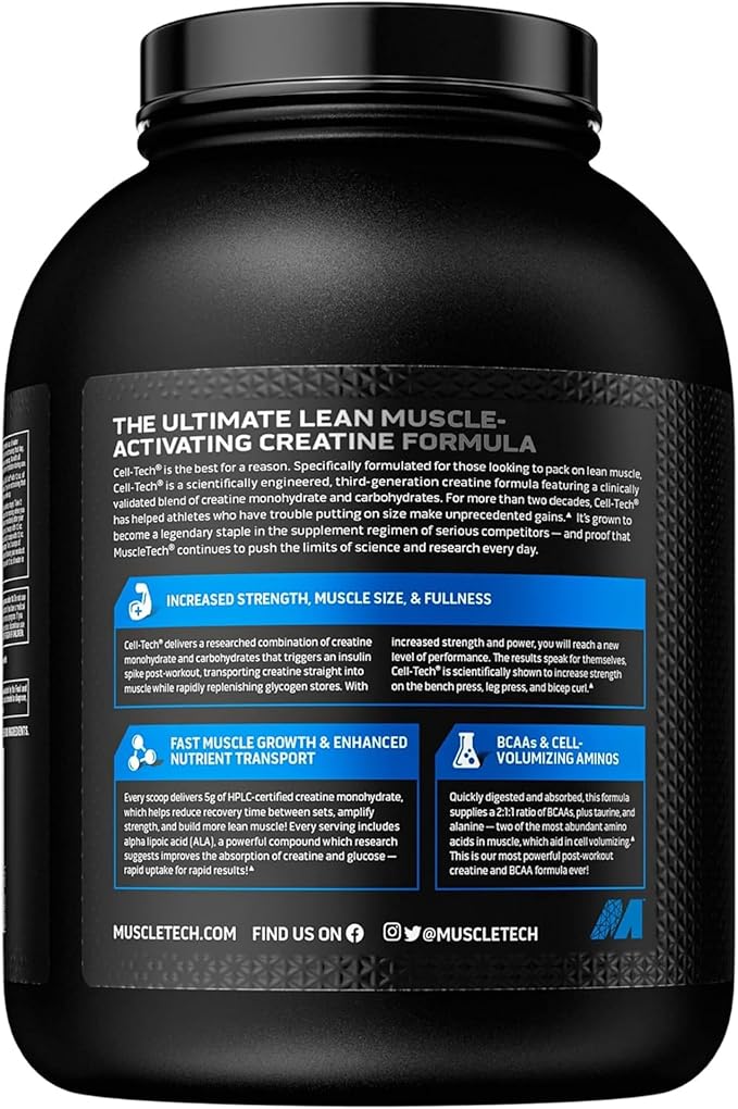 CELL-TECH is a scientifically engineered hardcore creatine formula designed for hard gainers who have trouble putting on size and strength. This patent-protected creatine formula contains core ingredients supported by over 30 research studies conducted over multiple decades.
